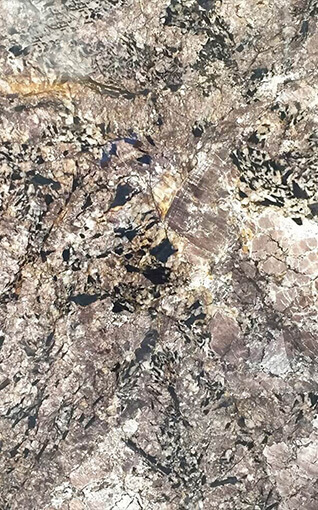 Acupullo Brown is a striking granite with a dynamic mix of warm browns, charcoal blacks, and crystalline grays. Its fractured texture and reflective highlights make it a luxurious choice for impactful interior spaces.