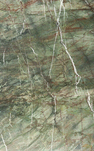 Amazonite Quartzite features lush green tones with bold white veining and earthy undertones, creating a vibrant, exotic look ideal for upscale interiors.