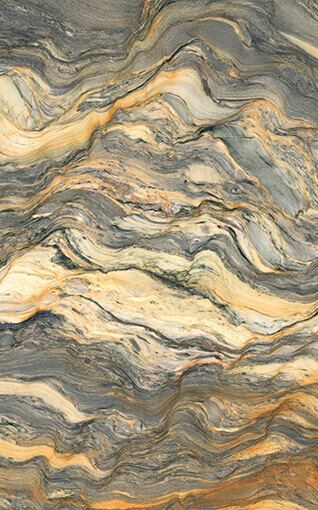 A dramatic natural stone with flowing waves of blue, cream, gold, and gray, ideal for bold interior accents and luxury countertops.