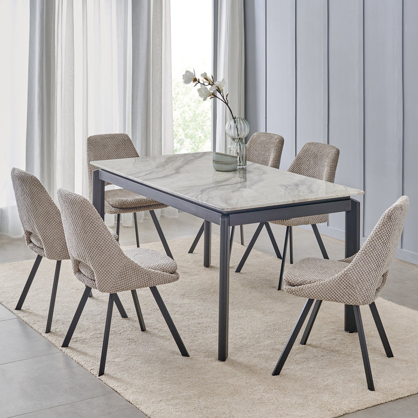 Elevate your dining area with the contemporary elegance of the Nexa Dining Set. This 6-seater ensemble pairs a sleek, marble-look tabletop with a strong metal frame for a clean, minimalist aesthetic. The ergonomically curved chairs, upholstered in textured fabric, provide both comfort and a modern edge. Perfect for urban interiors seeking a blend of style and durability.